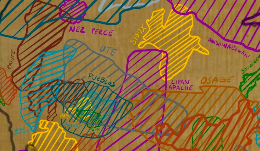 Because the collage covers an expansive geographic area, many of the labels indicating individual communities remain tiny and nearly illegible until greatly enlarged. This intentional choice underscores both the sheer number of groups that existed and the vastness of the land they occupied, prompting reflection on how much was lost over centuries of colonization.